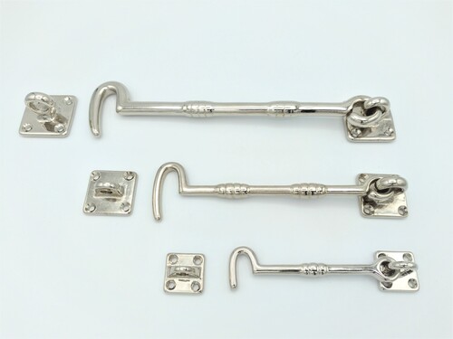 Cabin hooks are available from us in many different sizes, made in brass, black and nickel. Cabin hooks can prevent windows and doors from closing or opening because they can be secured. The difference between a wind hook and a cabin hook is that a wind hook is attached with a screw eye and the cabin hooks are attached with a plate with four loose screws.
